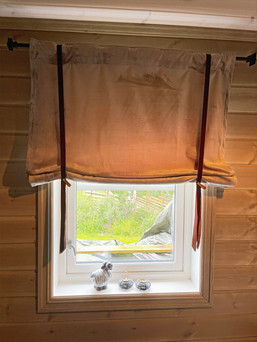 På gjesterommet på hytta hadde jeg til å begynne med svarte, lange velour-gardiner, men jeg følte at det ble litt feil.