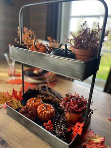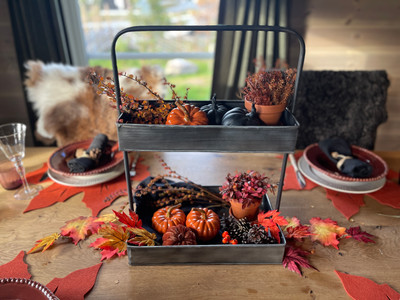 Et fint høstbord kan også løses med varianter av det som på bordekking-språket heter "centerpieces", f.eks som på bildene med vinesken i tre jeg har satt rustikke håndtak på eller et etasjefat fra Ib Laursen. Dette har jeg brukt mye som både skalldyrplatå, lysfat, pyntefat og matstativ!