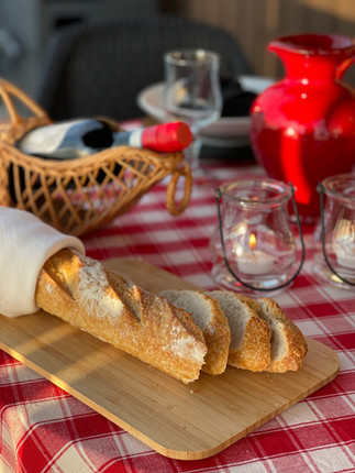 Baguetten skjæres på bordet surret i en hvit tøyserviett og med en fin rød mugge, 2 søte lyslykter og olje og balsamico-flasker gjorde resten av bordet seg selv!