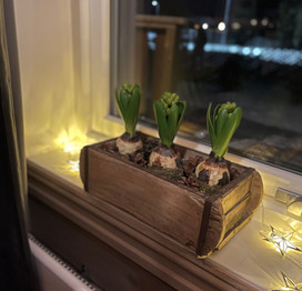 På gjesterommet: Hjemmelaget juletre-dekor plassert i vinduet, en liten granbarkvist i en vase Espen lagde i keramikken på barneskolen, samt 1 reinsdyr i rust som jeg kjøpte inn til fjorårets julebord.